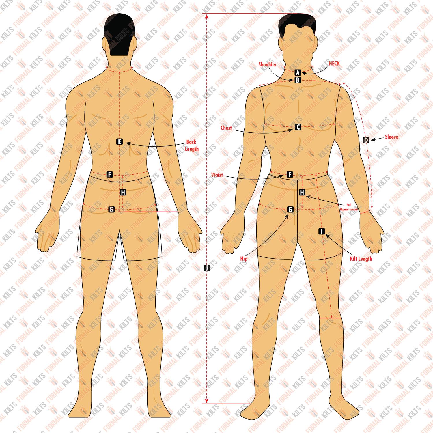 Please kneel on the ground, place the tape on the floor then measure up to your belly button. Remember that kilts shouldn’t be worn too long! |